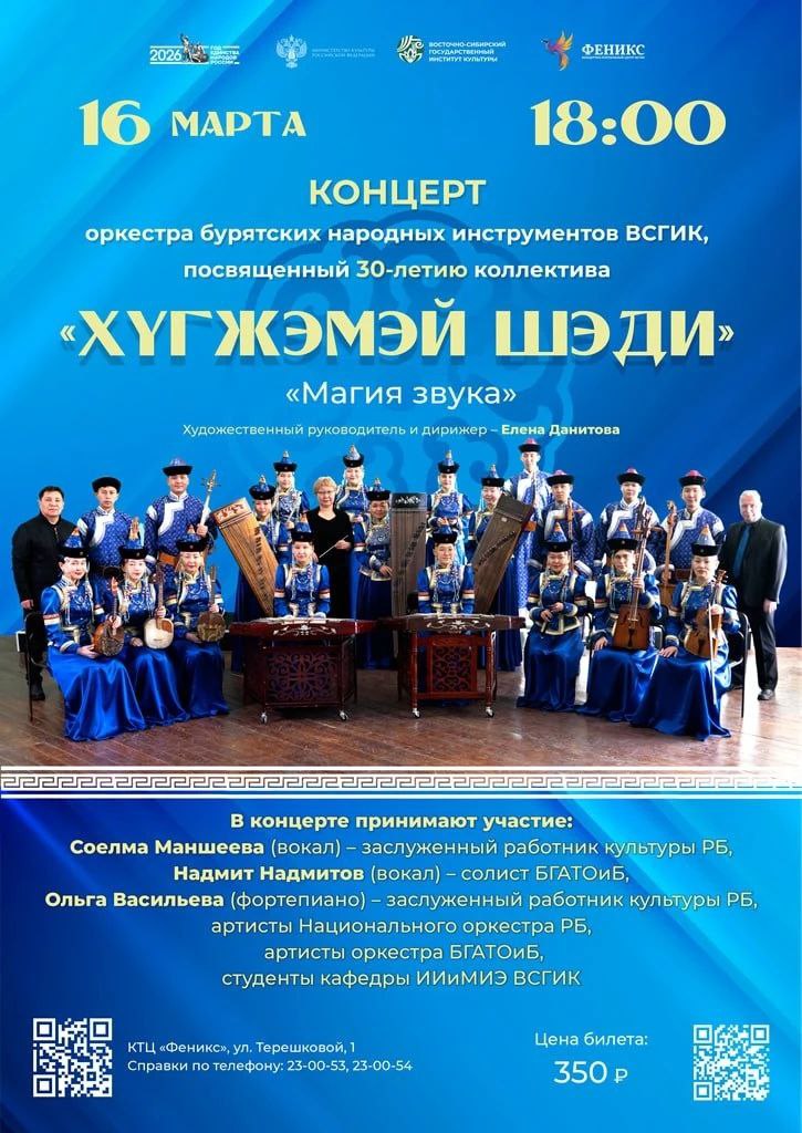 Свой 30-летний Юбилейный сезон Оркестр бурятских народных инструментов ВСГИК отметил большим праздничным концертом под названием «Хүгжэмэй шэди» («Магия звука»), прошедший 16 марта в Концертно-театральном центре "Феникс". Коллектив был создан на кафедре народных инструментов ВСГИК в 1995 году. До 2025 года оркестром руководил заслуженный работник культуры России и Бурятии, профессор Виктор Андреевич Михайлов. За этот период было дано свыше 30 афишных концертов, более ста концертных выстулений, подготовлены ряд творческих проектов, записаны 4 DVD диска, изданы три сборника партитур из репертуара оркестра. В настоящее время художественным руководителем является ст. преп. кафедры ИИиМИЭ Елена Ивановна Данитова. Мы поздравляем коллектив Оркестра бурятских народных инструментов и Елену Данитову с замечательным Юбилеем и желаем дальнейшего развития, роста профессионального мастерства, новых программ и творческих проектов!!! См. подробнее